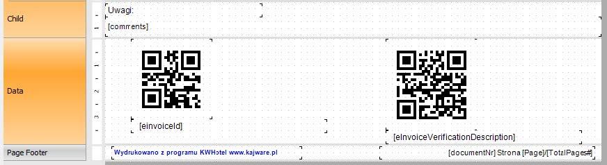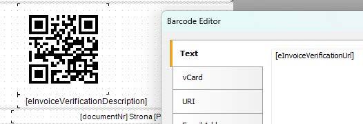 Parametry [einvoiceId] oraz [eInvoiceVerificationDescription] możesz umieścić pod odpowiednim kodem QR jako zwykłe pole tekstowe. Jeśli nie są one widoczne na liście dostępnych parametrów, możesz wpisać je ręcznie w miejscu, w którym mają się pojawić.