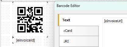 Aby ustawić adres URL dla kodu QR, kliknij go dwukrotnie i w polu Text wklej odpowiedni parametr, np. [eInvoiceUrl] lub [eInvoiceVerificationUrl].