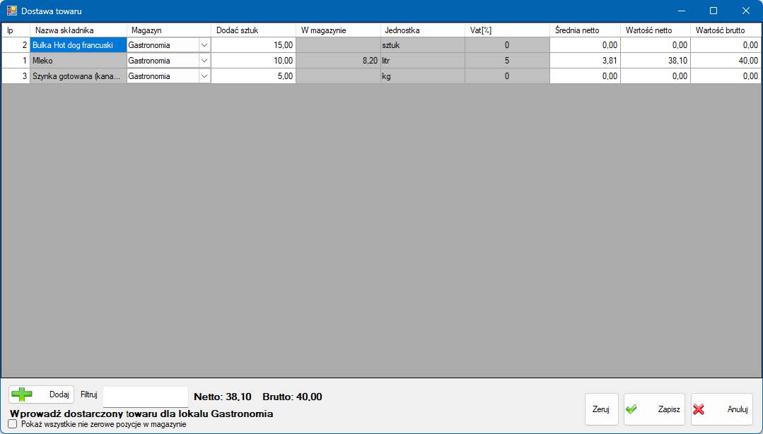 Funkcja Dostawy służy do uzupełniania stanów magazynowych o składniki, które fizycznie dotarły do obiektu.