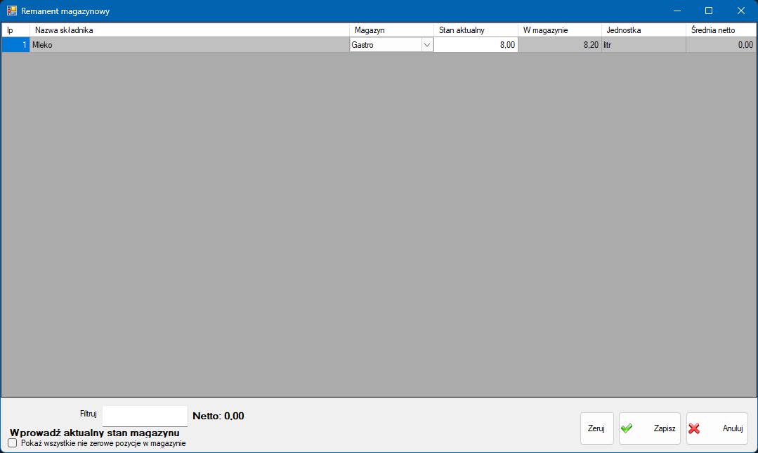 Aby dodać remanent, kliknij przycisk Remanenty w zakładce Składniki. Następnie wybierz lokal (magazyn), którego dotyczy remanent. Wyszukaj składniki, dla których chcesz przeprowadzić remanent i wprowadź różnice.