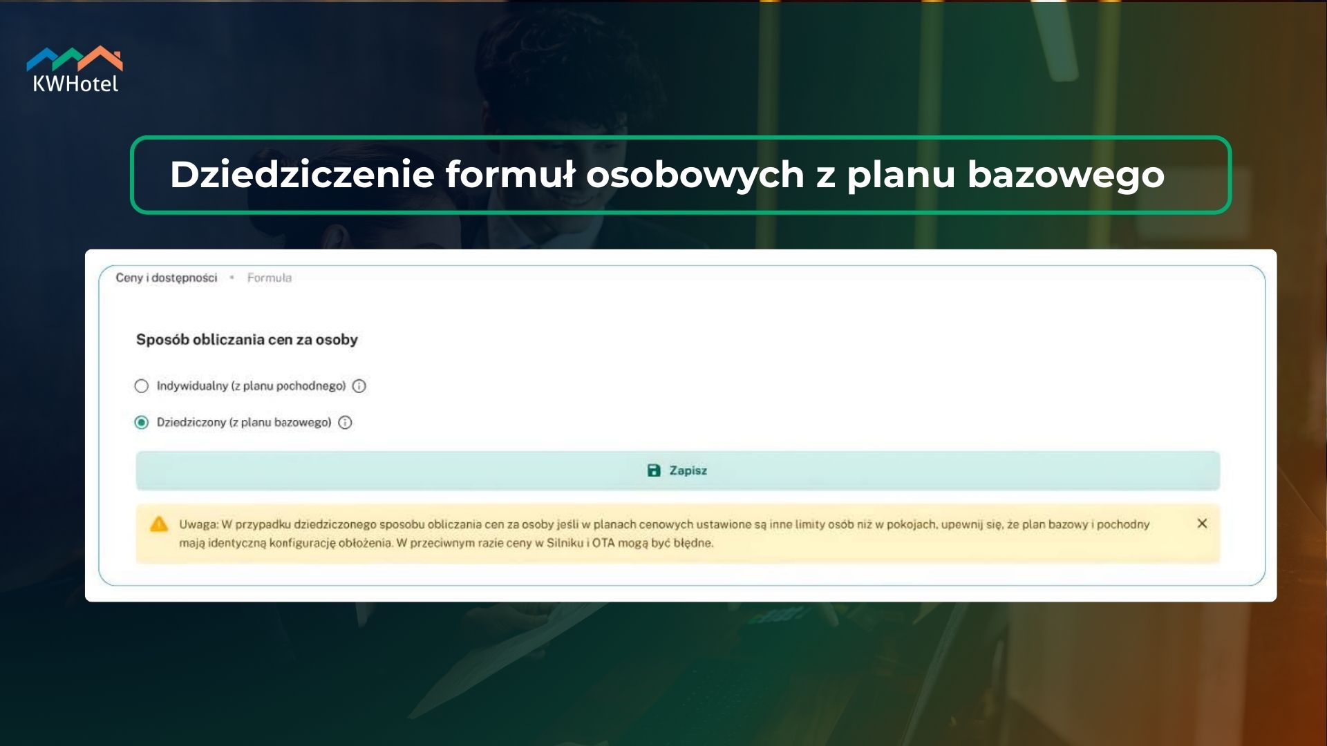W lutym wprowadziliśmy istotne usprawnienie w zakresie formuł osobowych w środowisku KWHotel Cloud. Od teraz system pozwala na dziedziczenie formuł osobowych z planu bazowego do planów pochodnych, co znacząco upraszcza zarządzanie polityką cenową.