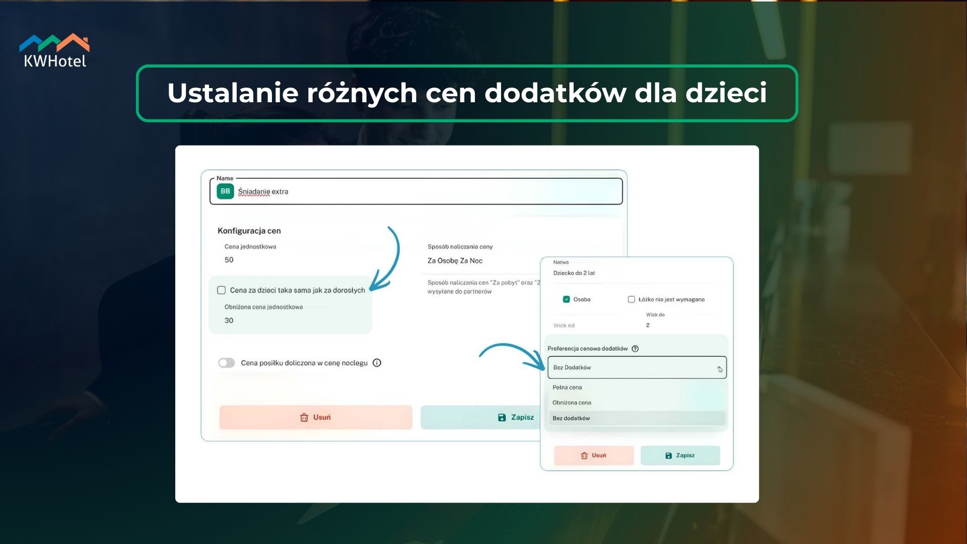 Osobne ceny dodatków dla dzieci w KWHotel Cloud